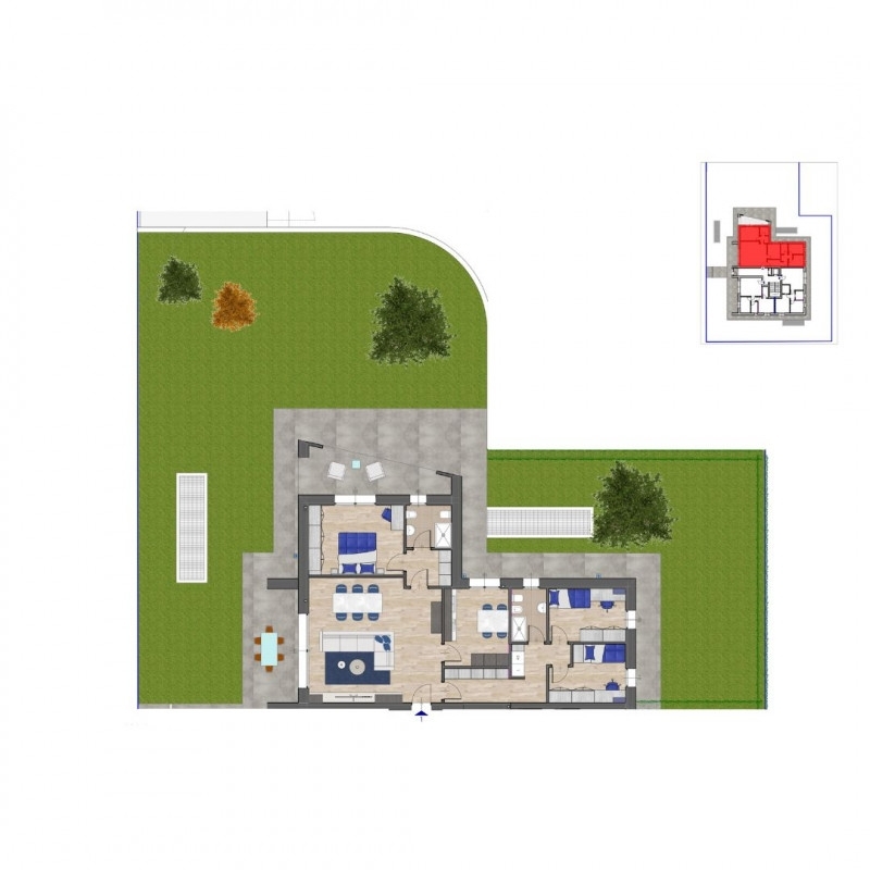 L'abitazione si compone di un ampio e luminoso soggiorno con affaccio su un portico di grande metratura, perfetto per godere degli spazi all'aperto in totale privacy, circondato da un giardino privato di circa 400 mq, disposto su tre lati. La cucina è abitabile, ideale per la vita quotidiana e per accogliere la famiglia. La zona notte è sapientemente suddivisa in due aree distinte: la prima zona notte ospita una spaziosa camera matrimoniale con bagno privato e accesso diretto al portico e al giardino. La seconda zona notte, accessibile da un comodo disimpegno, è composta da altre due camere da letto, un secondo bagno e una pratica lavanderia. disponibile box auto su richiesta.