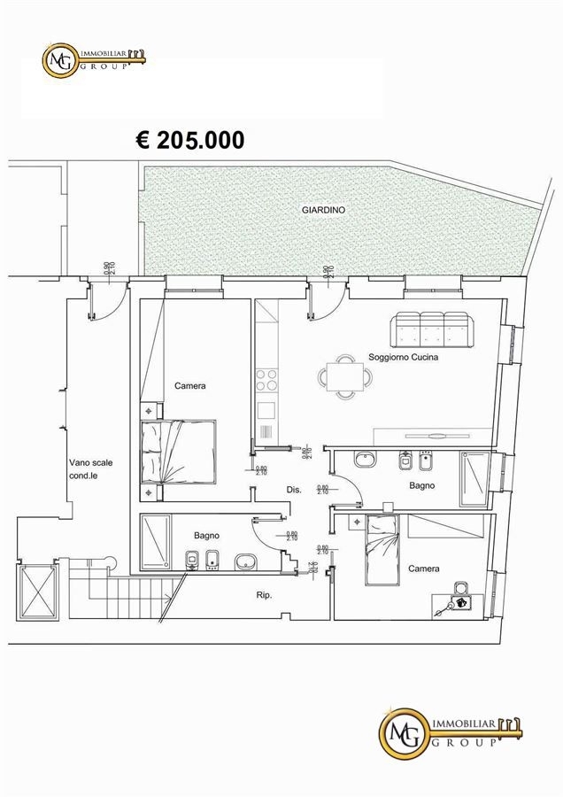 L'abitazione si apre su una luminosa e spaziosa zona giorno, composta da un ampio soggiorno con angolo cottura integrato che gode di un'ottima esposizione grazie alle grandi portefinestre con accesso diretto al giardino privato. Un funzionale disimpegno separa l'area living dalla zona notte, dove si trovano la camera matrimoniale, una seconda camera da letto e i doppi servizi, di cui uno principale finestrato e un secondo bagno dotato di impianto di aspirazione forzata. - maggiori dettagli: porta blindata