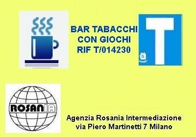 Zona padova, bar tabacchi con giochi e slots, 5 luci in posizione angolare, consumo settimanale di caffè kg 18, brioches 120-130 al giorno. Incasso banco euro 1000/gg, aggi superiori a euro 200000. Affitto euro 30000. Anticipo richiesto euro 380000. Per informazioni contattare agenzia rosania intermediazione via piero martinetti 7 milano tel indicando il numero di riferimento t sc8601037