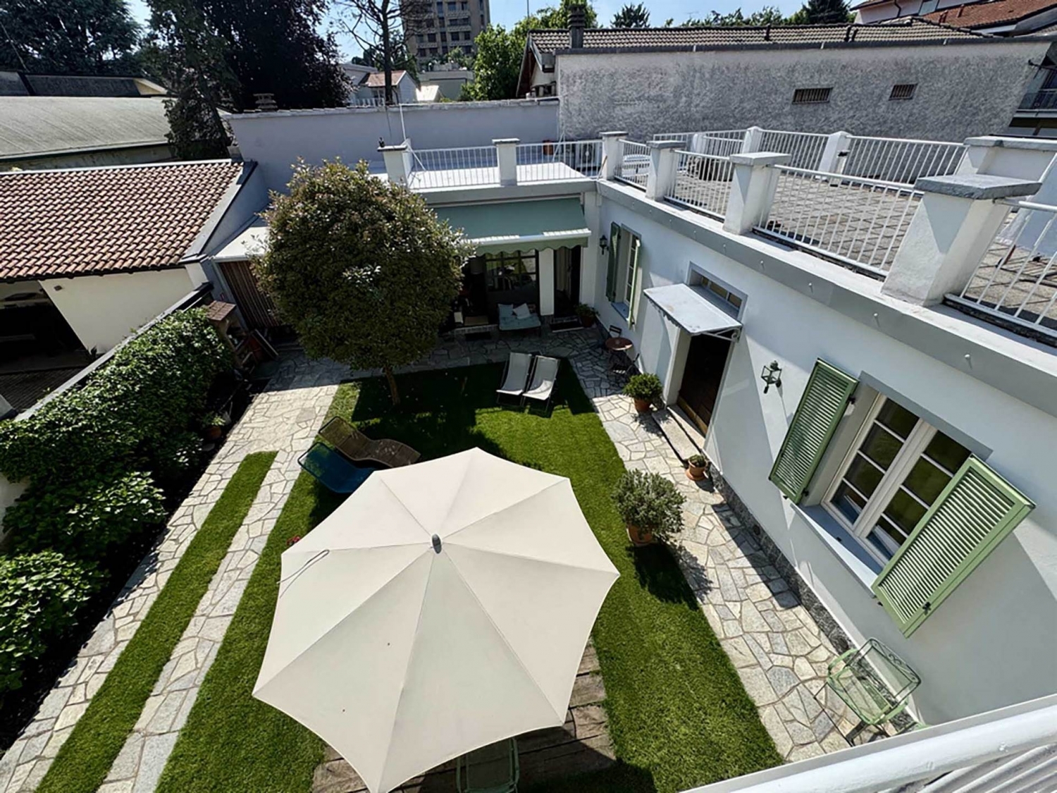Collocata in una zona prossima al centro storico, dalla quale è possibile raggiungere tutti i principali servizi alla cittadinanza senza utilizzare l'auto, nelle immediate vicinanze di un parco pubblico, con ampia possibilità di posteggio, comoda per raggiungere la stazione ferroviaria ed anche lo svincolo autostradale, la soluzione indipendente che proponiamo è inserita in un contesto urbanizzato ma nel contempo strutturata in modo tale da garantire privacy e riservatezza.la costruzione nasce su un impianto degli anni quaranta del secolo scorso per essere poi trasformata, a seguito di una integrale e recentissima ristrutturazione, in un progetto moderno e singolare che si sviluppa su due livelli attorno ad un grazioso giardino interno che funge da fulcro della casa.il piano terreno, che si snoda su tre lati del giardino, alloggia: il corpo principale dell'abitazione composto da un atrio d'ingresso, un comodo soggiorno, un'ampia cucina con sala da pranzo ed un bagno ospiti; altri due locali, ciascuno dotato di un bagno dedicato, a disposizione per gli usi più diversi; sempre a cornice del verde privato, ma separato dall'abitazione principale, vi è un locale hobby, corredato da due ripostigli e da una funzionale lavanderia. Ampie finestre donano respiro e luce a tutti questi ambienti.il primo piano vede la presenza di due camere da letto, di cui una dotata di cabina armadio ed angolo studio, di un bagno e di una terrazza.nell'interrato, areato grazie a quattro bocche di lupo, si trovano due ampi vani cantina e la centrale termica nonché i quadri di tutti gli impianti tecnici in dotazione. sul lato di fondo del cortile, una autorimessa, un posto auto ed un locale attrezzi completano la realtà.la soluzione si sviluppa su 200 mq complessivi, oltre ai locali accessori ed allo spazio cantinato di 75 mq.le finiture sono accurate e particolari: un parquet di rovere europeo a listoni, posato a correre, si intreccia ad una pavimentazione realizzata con cementine antiche, variamente decorate. Gli interventi realizzati, che comprendono anche la ripresa di alcuni elementi originali sapientemente restaurati, hanno consentito di ottenere ambienti molto accoglienti dal sapore unico.i serramenti sia interni che esterni, persiane comprese, sono stati tutti sostituiti; gli impianti, idrotermosanitario ed elettrico, sono stati completamente rifatti e da ultimo sono stati montati dei pannelli fotovoltaici: la presenza di tutte queste dotazioni di nuovissima generazione garantisce una resa assolutamente performante anche a livello di contenimento energetico.attualmente alcuni spazi della casa, debitamente separati, sono utilizzati come b&b, attività fiorente e facilmente gestibile, che gode di ottime recensioni da parte degli utilizzatori e che potrebbe essere mantenuta in essere qualora di interesse. Classe energetica: d