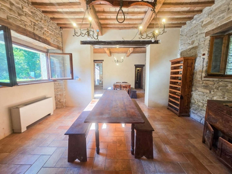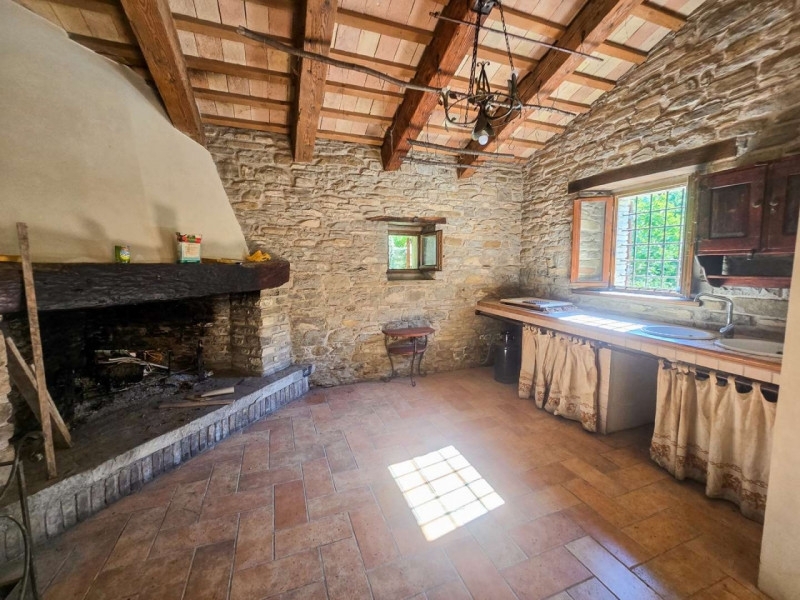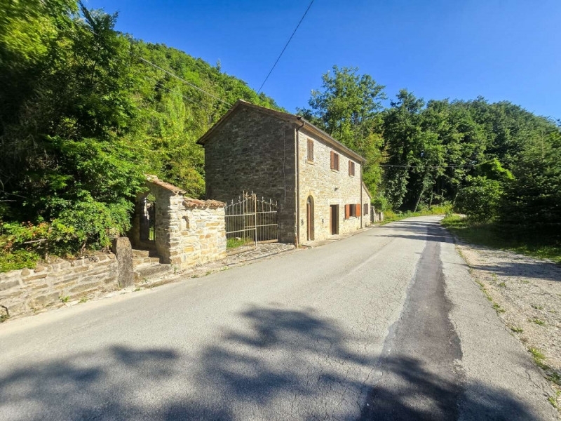 Lungo le rive del torrente sant'antonio vendesi casale di campagna in pietra con terreno adiacente, distante pochissimi minuti dal centro di mercatello sul metauro (uno dei borghi più belli d'italia). La proprietà è posta lungo la stradina che dal centro paesano raggiunge i borghi di montedale e guinza e il valico de la fienale.la proprietà include un casale in pietra ristrutturato disposto su due livelli con un piccolo scoperto pertinenziale ed un ampio terreno adiacente di circa 4 ettari prevalentemente boschivi.l'ingresso dell'abitazione si affaccia direttamente sulla via pubblica e può avvenire sia da portone laterale che conduce al vano scala interno, sia da portone centrale verso la zona giorno. Al piano terreno si sviluppa infatti uno spazioso soggiorno al cui fianco troviamo la cucina con ampio camino ad angolo. Al piano anche un pratico ripostiglio sottoscala. Tutti gli ambienti del livello sono caratterizzati dalla presenza di travi a vista, architravi in legno e pavimentazione in cotto.risalendo la scala interna si raggiunge il piano primo al cui interno si sviluppa la zona notte. Un lungo disimpegno consente di raggiungere la camera padronale, una seconda camera da letto con camino ed il bagno. Il casale è stato oggetto di recente ristrutturazione e si presenta in buone condizioni di manutenzione.accanto all'abitazione è presente lo scoperto pertinenziale prevalentemente a prato con accesso carrabile da cancello privato in ferro. Adiacente alla casa si sviluppano inoltre circa 4 ettari di terreno prevalentemente scoscesi e boschivi.sul fronte del casale, sull'altro lato della strada pubblica, è presente un piccolo appezzamento di terreno di proprietà, perfetto come posto auto esterno.