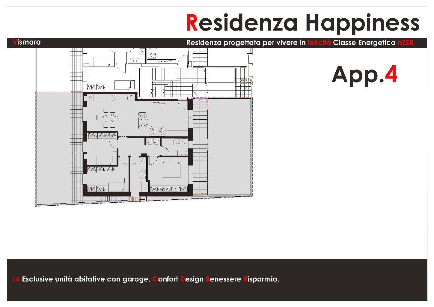 si accettano prenotazioni per il nuovissimo complesso residenziale (residenza happiness) composto da 8 appartamenti moderni, eleganti e confortevoli con prestazioni energetiche di alto livello (classe energetica nzeb), da mq 90 a mq 100, completano le proprietà giardini esclusivi e/o terrazzi abitabili oltre a garage esclusivi a scelta da 22 mq a 29 mq; dotato di tutti i più moderni impianti, per ottimizzare il risparmio energetico, con riscaldamento a pavimento o pompa di calore, pannelli fotovoltaici privati e ventilazione meccanica controllata (vmc) per garantire il vostro benessere all'interno dell'alloggio! consegna prevista marzo 2027.