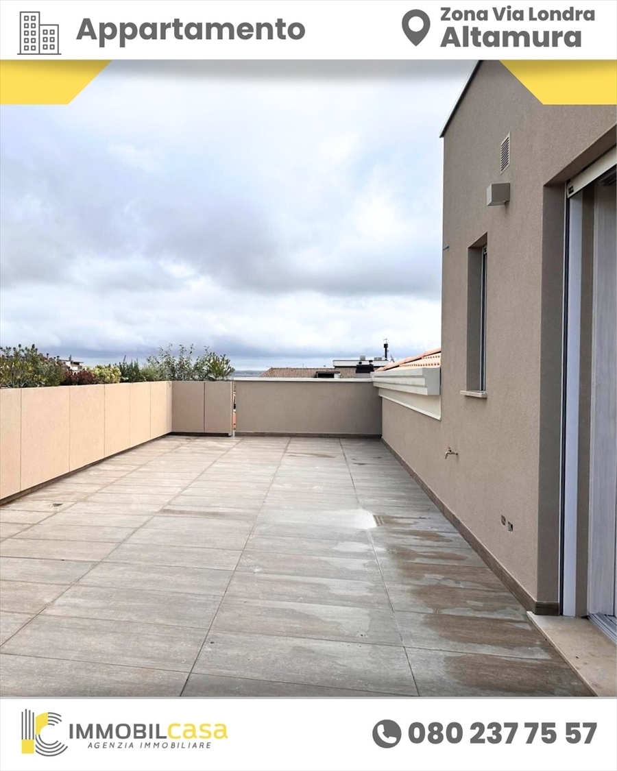 Rif 120ad altamura, in una zona tranquilla come quella di parco san giuliano, proproniamo la vendita di un bellissimo attico di nuova costruzione posto al terzo piano di un palazzo residenziale molto elegante di soli tre piani.l'attico si divide in 4 ampi vani per un totale di 196 mq interni, distribuiti in zona giorno open space, 3 camere da letto, 2 bagni e una spaziosa veranda di circa 102 mq, ideale per il vostro relax estivo.la nostra soluzione è resa molto luminosa grazie alla sua quadrupla esposizione; gode di massima efficienza energetica grazie alla presenza di impianto personale con pompa di calore per la produzione di acqua calda e fotovoltaico di 3kw per ogni unità abitativa.inoltre, dispone di tutti i comfort per una abitazione accogliente, come riscaldamento a pavimenti e raffrescamento e ha anche la possibilità di abbinarci un garage a vostra scelta.