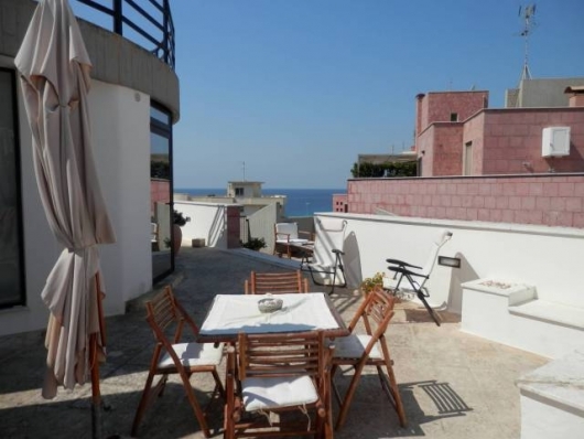 Puglia Salento a Gallipoli sul lungomare letteralmente fronte mare proponiamo in vendita meraviglioso attico. L'appartamento, ubicato all'ultimo piano di un residence di recente costruzione, si presenta praticamente nuovo con ottime finiture. Per accedere all'immobile, che occupa tutto l'intero piano dello stabile, oltre alle scale, c'è l'ascensore condominiale che arriva sin dentro l'appartamento ma soltanto con l'utilizzo di una chiave. All'interno c'è un ampio ingresso-soggiorno con zona cottura, due camere da letto e bagno. Esternamente un terrazzo, da cui si può ammirare con una vista mozzafiato l'inconfondibile mare di Gallipoli, di circa 200 mt. Che gira intorno alla casa, una zona coperta dove poter mangiare al riparo, zone relax e un solarium. L'attico è fornito di climatizzazione. Possibilità di box auto