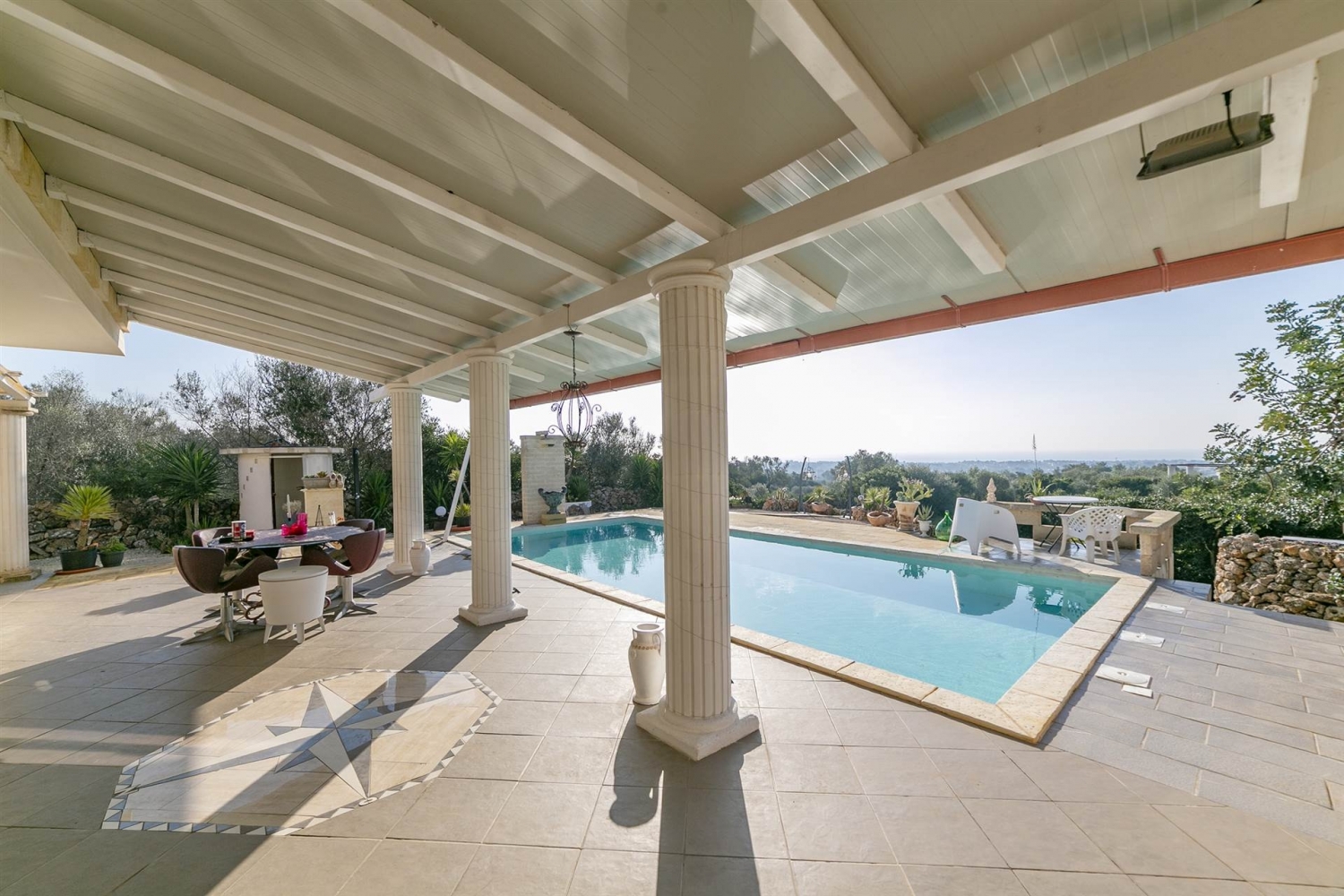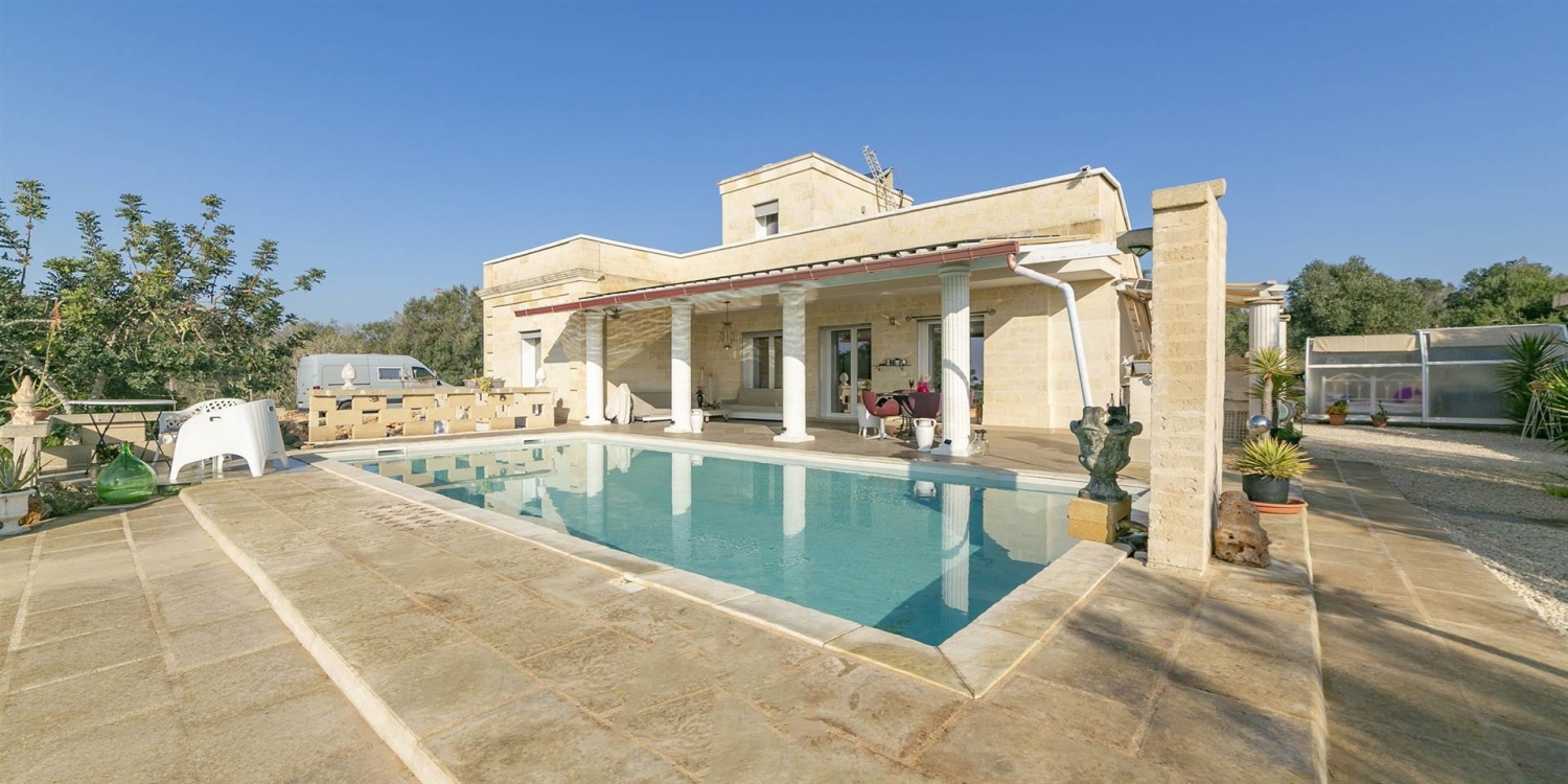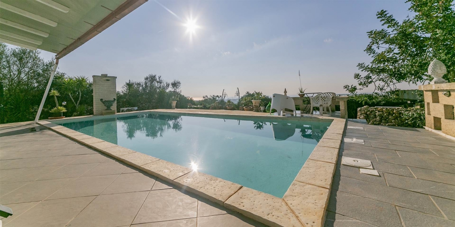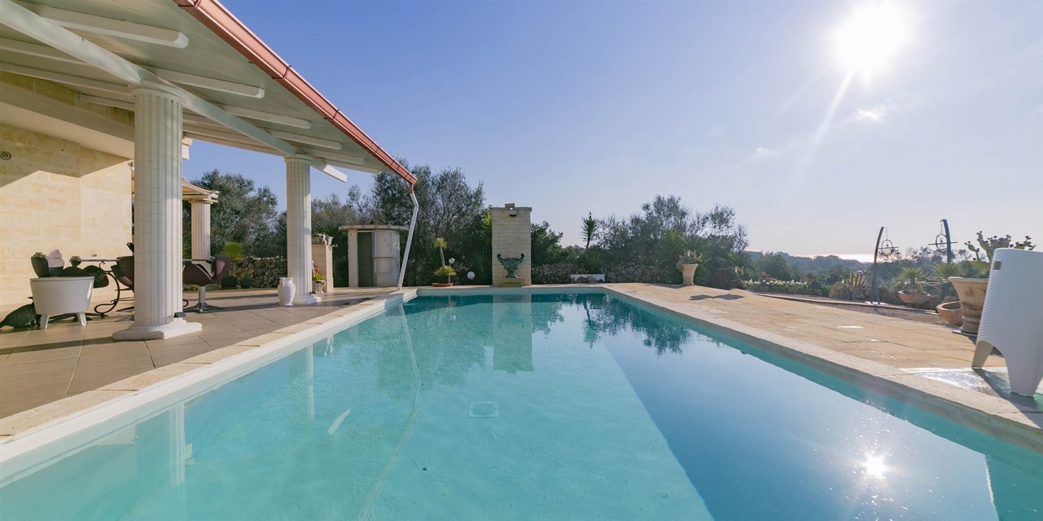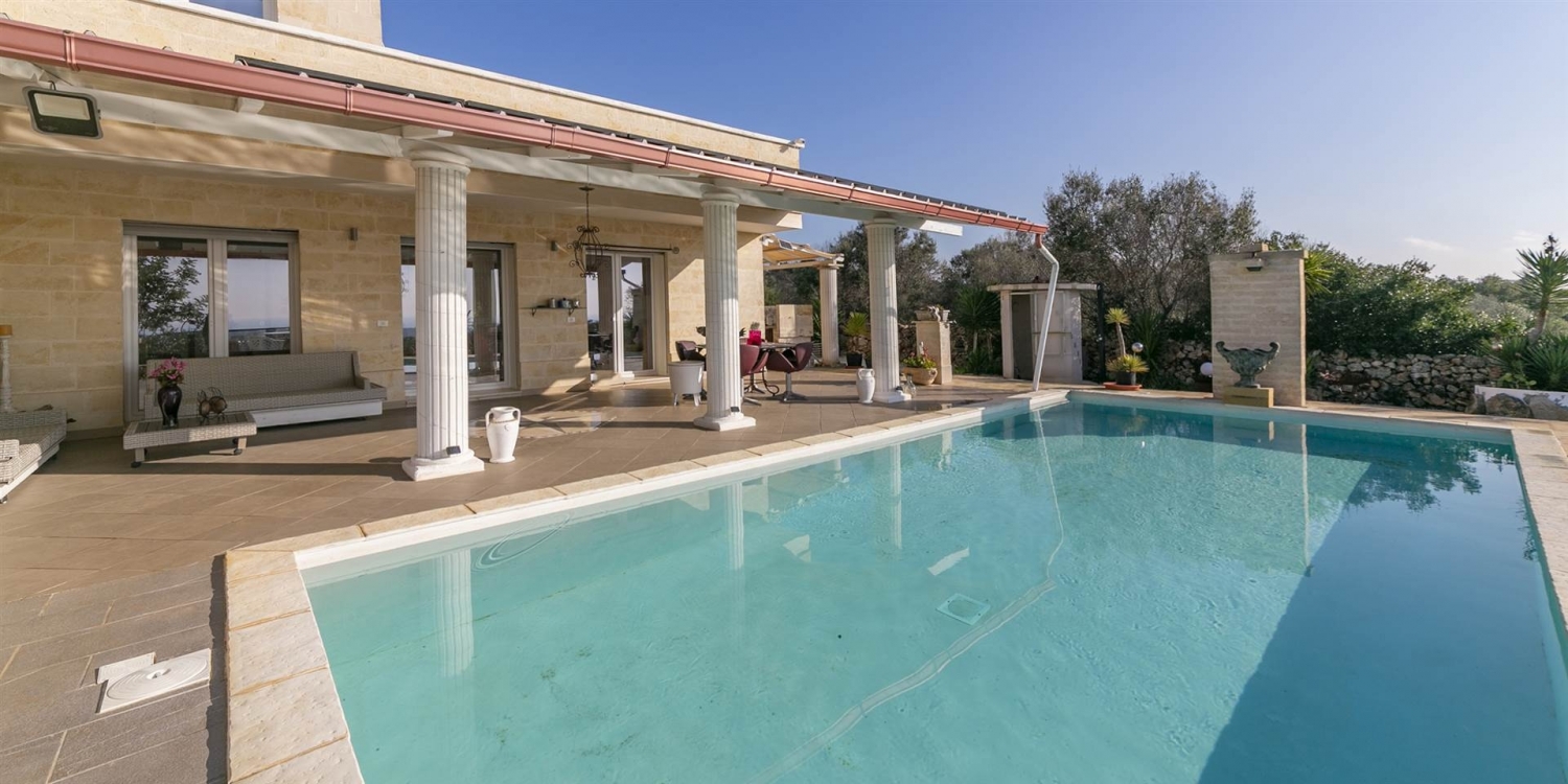 Nella cornice esclusiva e riservata di contrada demani, l'agenzia immobiliari riunite di nanna propone in vendita una villa unifamiliare di recente realizzazione, immersa nella natura e caratterizzata da una splendida vista mare, piscina privata e ampio terreno.la proprietà si estende su un terreno di circa 10.161 mq, con ulivi e macchia mediterranea, ed è completata da terrazzo con vano tecnico.accessi e spazi esternil'accesso avviene tramite cancello carrabile automatico, che conduce a un'ampia area parcheggio con più posti auto, di cui uno coperto da freschiera.all'esterno, la proprietà offre:- piscina interrata 10 x 5, inserita in un contesto di totale privacy- ampio porticato affacciato sulla piscina- veranda con travi in legno- due docce esterne- zona lavanderia esterna - terreno curato con vegetazione tipica mediterraneadistribuzione internadal portico si accede alla zona giorno composta da salone con cucina a vista, impreziosito da ampie vetrate panoramiche con affaccio sulla piscina e sul mare. Sono presenti quattro vani e due bagni.gli ambienti interni sono valorizzati da rivestimenti effetto tufo nel soggiorno e nella camera da letto; ogni stanza è dotata di impianto tv. l'immobile è dotato di videocitofono e wi-fi. caratteristiche costruttive e impiantistichela villa si distingue per l'elevata qualità costruttiva e le prestazioni energetiche di alto livello (classe a2).