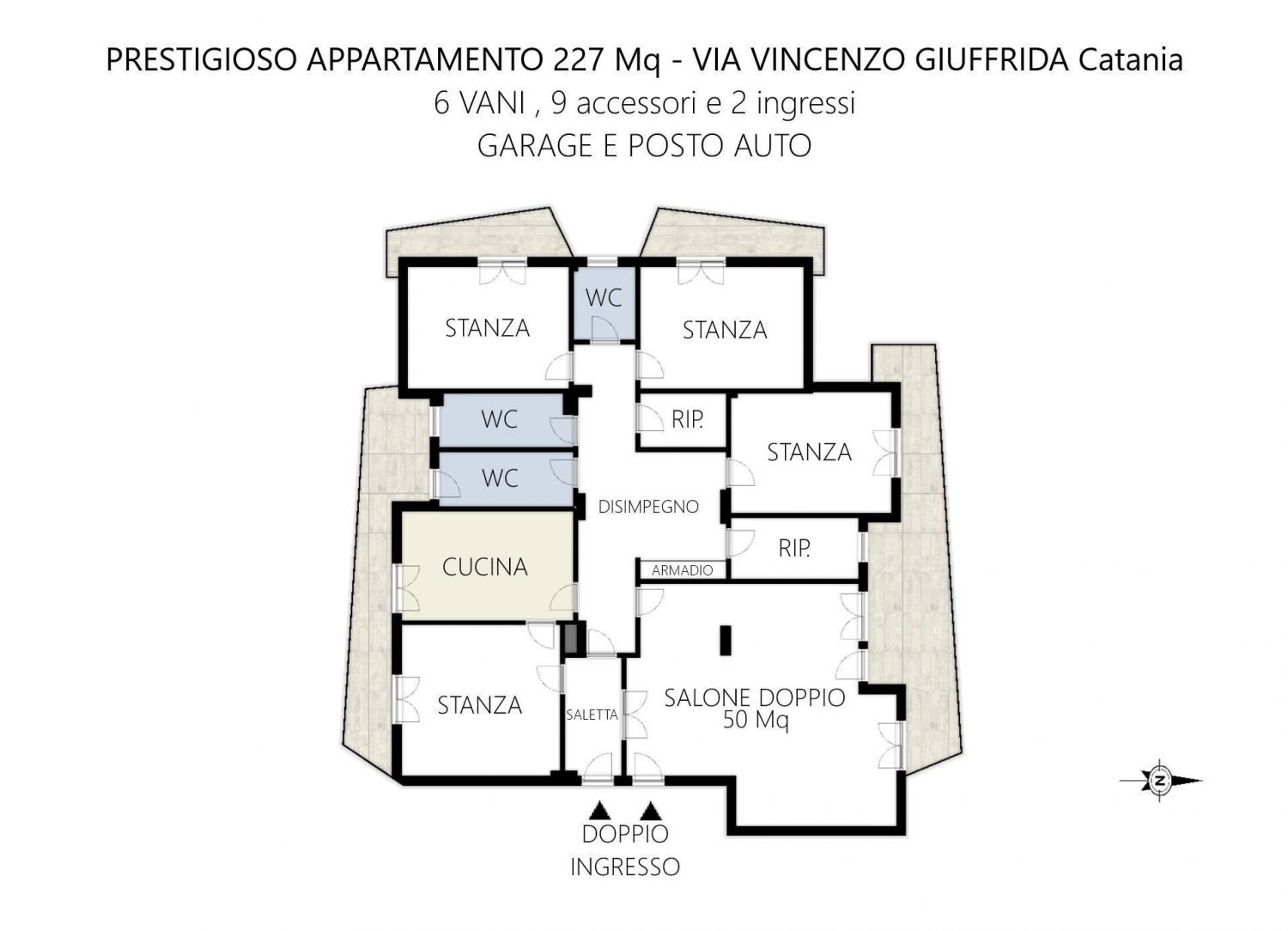 Rif g424**appartamento esclusivo in vendita - ampia metratura e versatilità**scopri questo appartamento esclusivo di ben 227 mq, situato al terzo piano di un contesto residenziale di alta qualità, ubicata a catania su via vincenzo giuffrida parte alta, poco sotto la circonvallazione.con una struttura che comprende 6 vani e 9 accessori, questa proprietà offre infinite possibilità di utilizzo: dall'abitazione all'investimento o usi promiscui. L'abitazione dotata di doppio ingresso condominiale, facilmente divisibile in 2 appartamenti, ottima per liberi professionisti che desiderano realizzare abitazione più studio/ufficio, perfetta anche per aziende che hanno la necessità di sedi aziendali, per cliniche e studi medici e studi associati. l'immobile mantiene le condizioni originali degli anni '70, offrendo l'opportunità di personalizzarlo secondo il proprio gusto. Il salone doppio di 50 mq, le 4 stanze utili, i 2 ripostigli, i 2 armadi a muro e i 3 bagni garantiscono ampi spazi da vivere. La tripla esposizione con balconi terrazzati regala e assicura un ottima luminosità.inoltre, il garage di proprietà di 26 mq e i numerosi posti auto disponibili nell'area condominiale rendono la vita quotidiana ancora più comoda.l'immobile inoltre, ad oggi accatastato come civile abitazione categoria a2, è stato in passato oggetto di cambio destinazione d'uso in categoria a10 ufficio, proprio per questo rappresenta un ottima opportunità per tutte le attività professionali che hanno necessita di sedi accatastate in categoria a10 (ripristinabile). non perdere l'opportunità di acquistare questa versatile soluzione e di adattarla alle tue esigenze personali. contattaci per maggiori informazioni e per organizzare una visita!