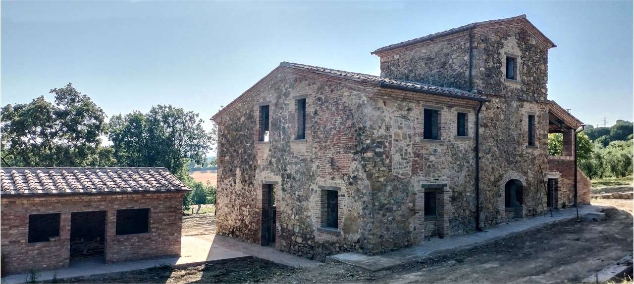Lucignano, in uno dei borghi più belli d'italia in posizione incontaminata e contornata dal verde della tipica campagna toscana, vendesi bella casa colonica tutta ristrutturata allo stato grezzo in cui sono stati eseguiti tutti i lavori per rendere il fabbricato antisismico, iniziando dalle fondazioni, cordoli perimetrali, solai e tetto; il fabbricato ha una superficie complessiva di mq 250 circa e si sviluppa su tre livelli; le murature esterne sono tutte in pietra e mattoni faccia-vista, la struttura tipica è particolarmente mossa ed articolata, donando all' edificio una piacevole armonia, inoltre sia all' esterno che all' interno sono mantenute le caratteristiche originali. Adiacente si trova la vecchia porcilaia di mq 20 circa, anch' esso già ristrutturata al grezzo, la quale può essere convertita a civile abitazione; c'è un pozzo artesiano con acqua in abbondanza. Completano la proprietà terreno di circa 3 ha. Tra cui un bellissimo oliveto in piena produzione. classe energetica: g
