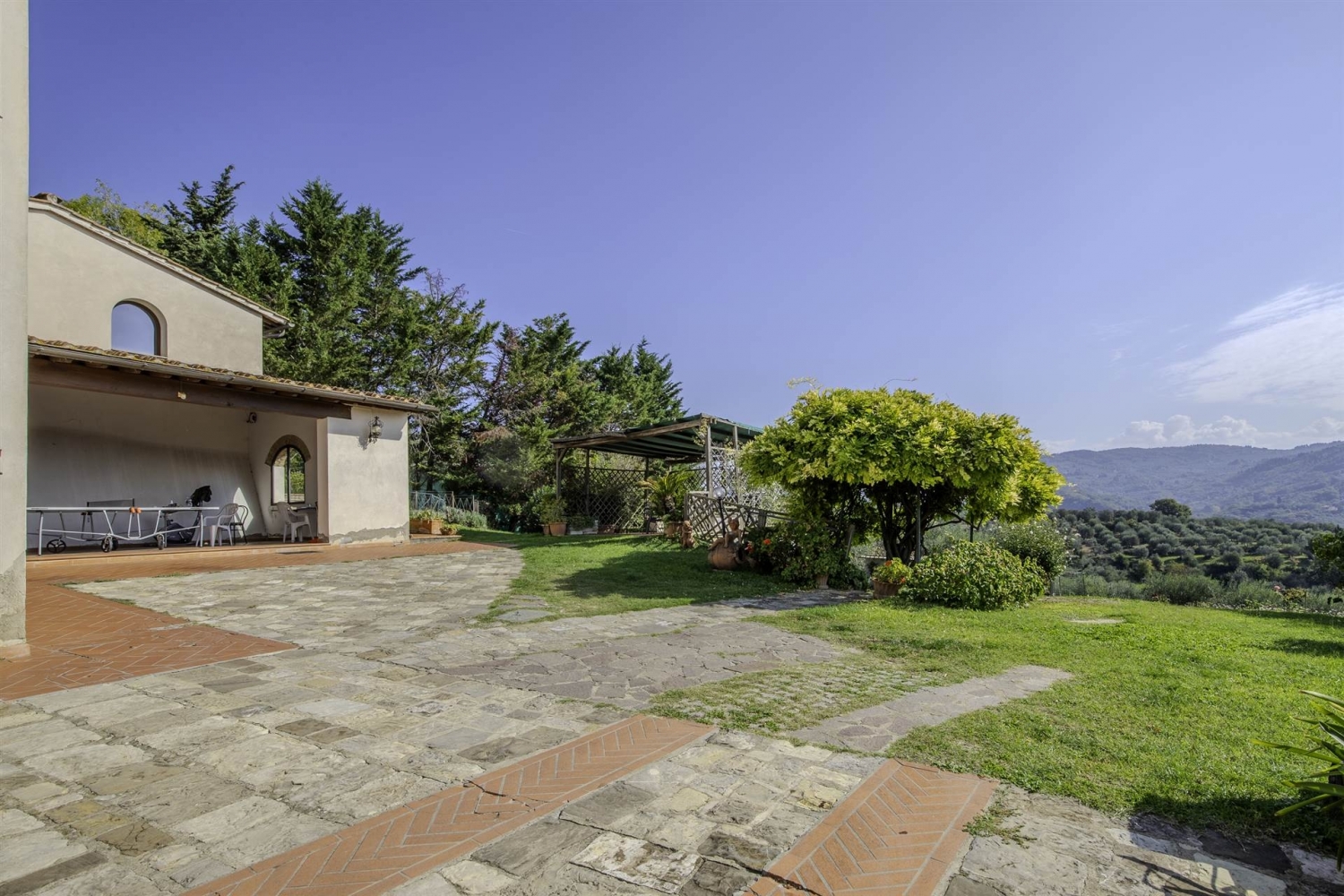 Girone, in posizione panoramica, proponiamo una splendida colonica di circa 300 mq oltre 50 di ex-fienile, attualmente censita come unica unita' immobiliare ma di fatto divisa in due appartamenti indipendenti oltre ampio giardino su quattro lati e 5.000 mq di uliveto completamente recintato. Alla proprieta' si accede da un cancello carrabile esclusivo e comprende anche una cantina e locali ad uso magazzino. Le due abitazioni sono strutturate a terratetto con zona giorno al piano terreno e zona notte al primo piano. Le condizioni della colonica sono ottime, tranne una parte di circa 50 mq da ristrutturare che potrebbe diventare una terza unita'. classe energetica: g epi: 190 kwh/m2 anno