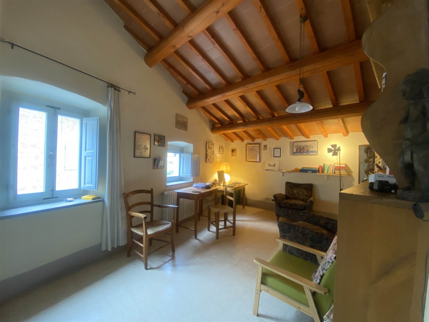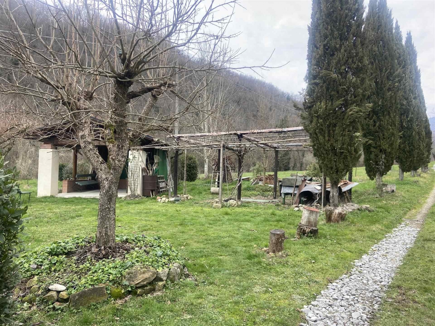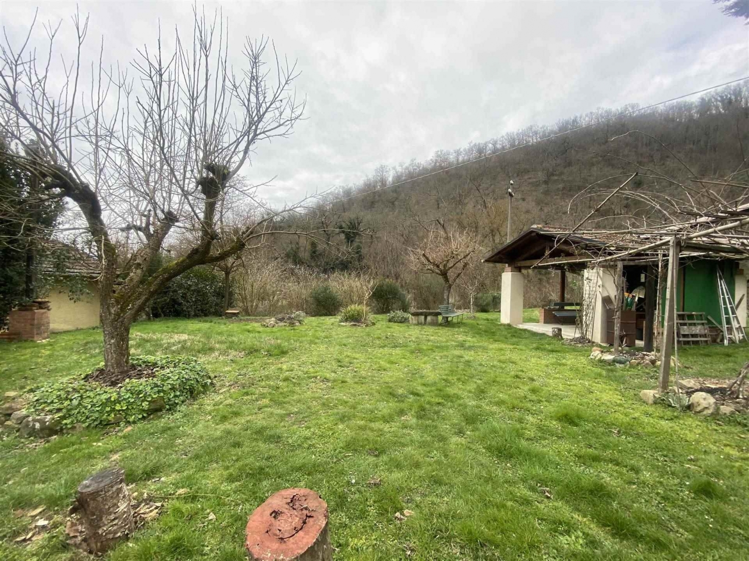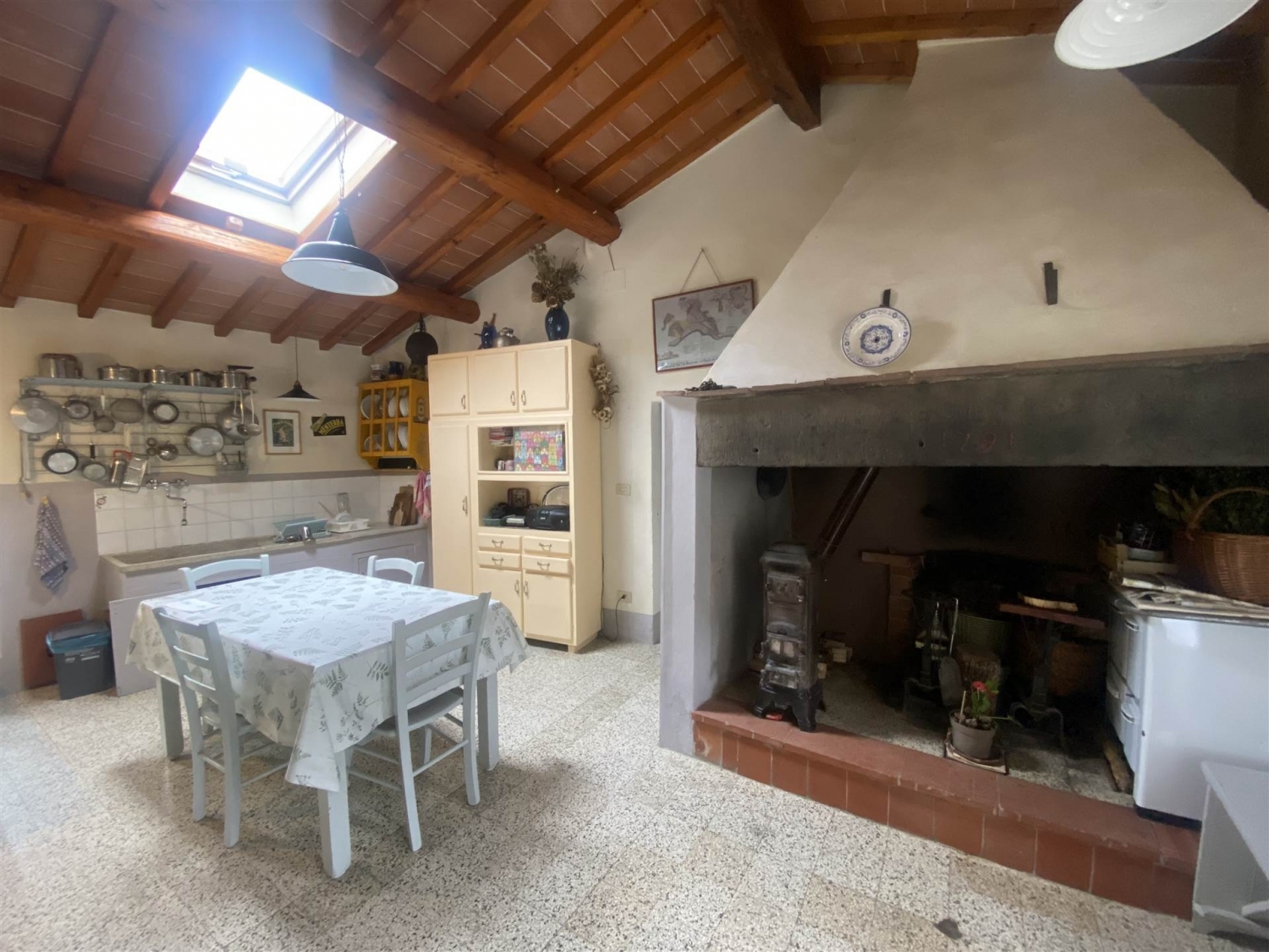 Casa di campagna in pietra ristruttuturata in modo conservativo, con resede, ampie pertinenze in muratura con podere di 7 ha vicino alla abitazione.l'abitazione e' una accogliente appartamento (classe energetica d) di 90 mq ca, libero su tre lati, e comprende due camere, cameretta/studio, disimpegno,due bagni,cucina con grande camino storico funzionante,vano attiguo alla cucina, locale caldaia con ingresso autonomo e resede.copertura e facciate dell'edificio principale sono state rifatte nel 2010 con opere di miglioramento strutturale,coibentazione e rifacimento degli infissi esterni. Le pertinenze hanno avuto le coperture sostituite di recente.l'impianto di riscaldamento e' con radiatori, caldaia a pellet del 2024 e serbatorio di accumulo,pannelli solari per la produzione di acqua calda sanitaria.l'impianto elettrico e l'impianto di trattamento dei refllui sono recenti e a norma.l'abitazione e' servita da strada asfaltata comunale ed acquedotto pubblico.le pertinenze e annessi comprendono:una legnaia con forno,un cortile lastricato,due ampie cantine con loggiato di accesso, una costruzione su due piani di 127mq (ex stalla-fienile), con tetto coibentato,una grande tettoia in muratura con due posti macchina coperti e altra superficie coperta (ex pollaio),un vano basso esterno (ex porcilaia),due resedi,di cui uno attrezzato a giardino dove sorge una elegante tettoia in muratura di 25 mq.,e sette ettari di terreno equamente divisi tra bosco attraversato da sentieri larghi e seminativo,quest'ultimo in buona parte pianeggiante con orto e frutteto in attivita', e disponibilita' di vene di acqua nel terreno privato. Una ampia particella di seminativo e' invece situata in posizione collinare di facile accesso ben esposta ed adatta per coltivazioni di tipo arboreo (olivi). Classe energetica: d epi: 175 kwh/m2 anno