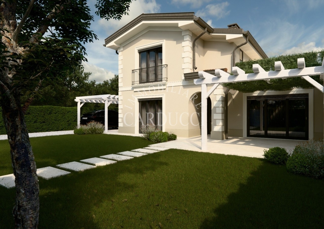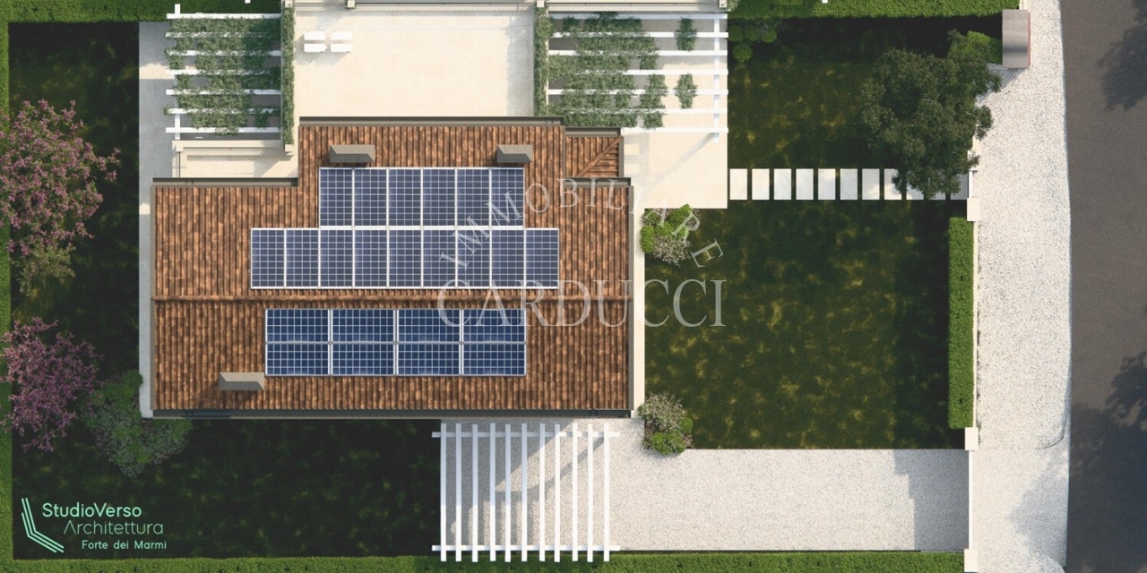 La villa, sviluppata su due piani per una superficie di circa 160 mq, unisce funzionalità e armonia architettonica. Il piano terra, leggermente rialzato rispetto al giardino - con un dislivello di appena un gradino - si presenta come un ampio open space illuminato da numerose aperture che creano un dialogo continuo con il verde circostante. Lo spazio principale, concepito per la convivialità, accoglie una cucina moderna con isola centrale, un'area dedicata ai pasti e una zona living, mentre due pergole esterne - una adiacente alla cucina e l'altra verso la sala - definiscono aree relax all'aperto senza interrompere la fluidità degli interni. Dall'ingresso, protetto da un portico coperto, si accede a un pratico armadio d'ingresso e a un bagno guest, affiancati da uno spazio polifunzionale di 20 mq e dal vano tecnico, collocati in posizione discreta ma accessibile direttamente dall'esterno. Una scala conduce al piano superiore, riservato alla privacy: qui tre camere e due bagni, caratterizzati da linee essenziali, sono collegati a una terrazza che offre una vista suggestiva sul paesaggio, ideale per momenti di quiete tra cielo e natura. Ogni dettaglio è studiato per valorizzare gli spazi vivibili: dalla disposizione razionale degli ambienti alla scelta di aperture generose che esaltano il contatto con il giardino, fino alla doppia pergola che trasforma gli esterni in prolungamenti naturali degli interni.