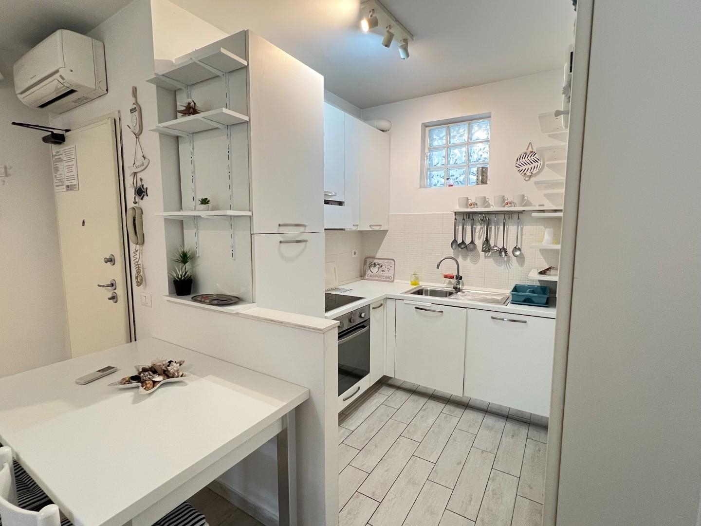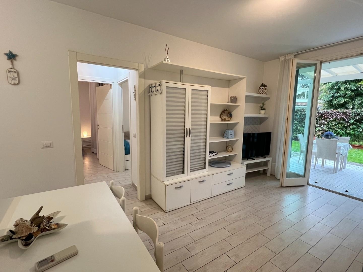 Rif: poveromo, a 400 metri dalle spiagge, vendesi appartamento di recente costruzione. Ingresso su soggiorno open space con angolo cottura e accesso al giardino privato, camera matrimoniale, cameretta, bagno con doccia. Giardino privato con veranda pranzabile e piccolo angolo lavanderia; ampia cantina nel piano seminterrato con accesso tramite scale e ascensore (per biciclette); parcheggio scoperto in area condominiale recintata e con cancello elettrico. Condizionatori caldo/freddo/deumidificatore. Viene ceduto arredato come da foto.