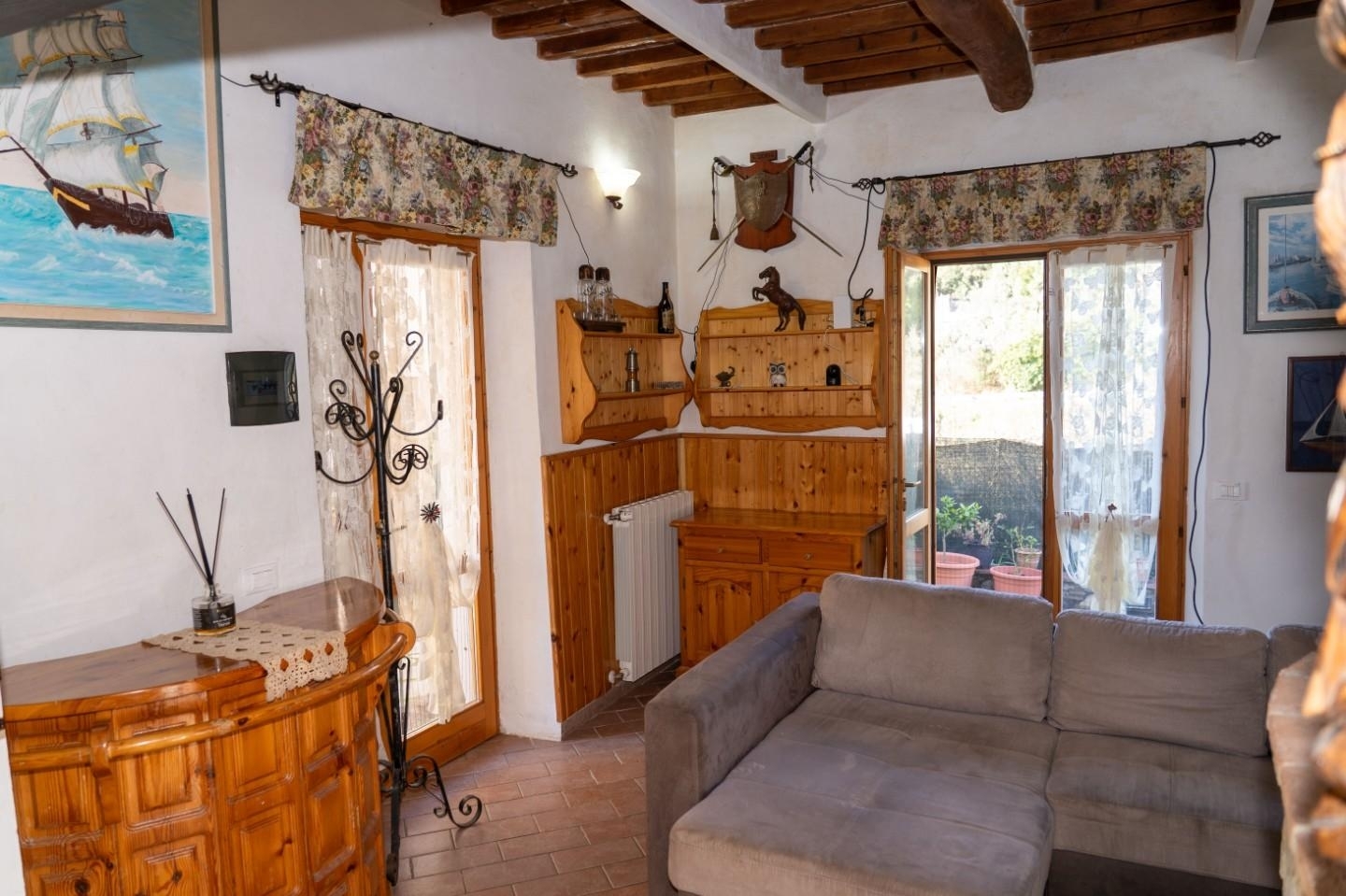 Rif: cin-06 - pastina (comune di santa luce). casa indipendente su tre lati, tipologia terratetto con superficie abitativa di circa 100 mq. E di altrettanta metratura il resede esclusivo pertinenziale. vista panoramica e ariosa in direzione mare. Si accede alla proprietà da spazio privato lastricato per consentire il passaggio e la sosta di varie auto, chiuso da cancello con apertura da casa; è presente un altro cancello dalla parte opposta rispetto a questo. Ristrutturata nel 2007 in stile toscano, comprende al piano terra: salotto con camino, tinello con ripostiglio. Da scala interna accediamo al piano notte con due camere matrimoniali, piccolo ripostiglio e bagno. Esternamente compresi nella vendita troviamo: 1) locale magazzino di 12 mq con proprio spazio di pertinenza 2) altro locale di sgombero di mq 10 3) terreno attiguo alla proprietà di mq 550, recintato, dove insistono varie piante ornamentali e da frutto (albicocco, melograno, pesco, melo, noce, mirto, limoni, viti ecc.). termo singolo a metano, infissi in legno, impianto di illuminazione esterno. tutto il contesto, l'abitazione ci portano ad una tipica realtà toscana di campagna, il calore del camino, le pareti in pietra, i particolari delle rifiniture. soddisfa esigenze abitative residenziali che vacanziere (specie utenza straniera).