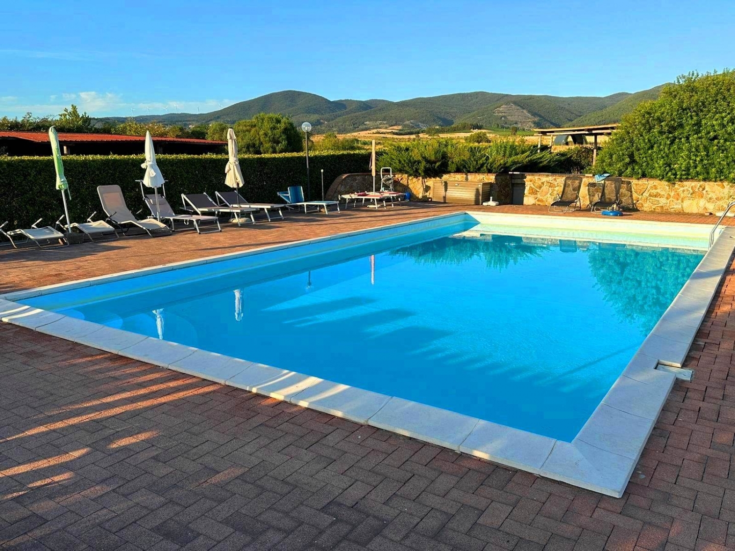 Pomaia, 14 km dal mare, in aperta campagna, nella totale quiete, con ampia vista panoramica, in antico casale ben restaurato, vendesi appartamento indipendente di 45 mq. Piano terra: pranzo soggiorno con angolo cottura e accesso diretta ad ampio loggiato, camera e bagno; ripostiglio lavanderia. Ampio giardino privato. Due posti auto. Piscina con ampio solarium e parco condominiale. Classe energetica: g