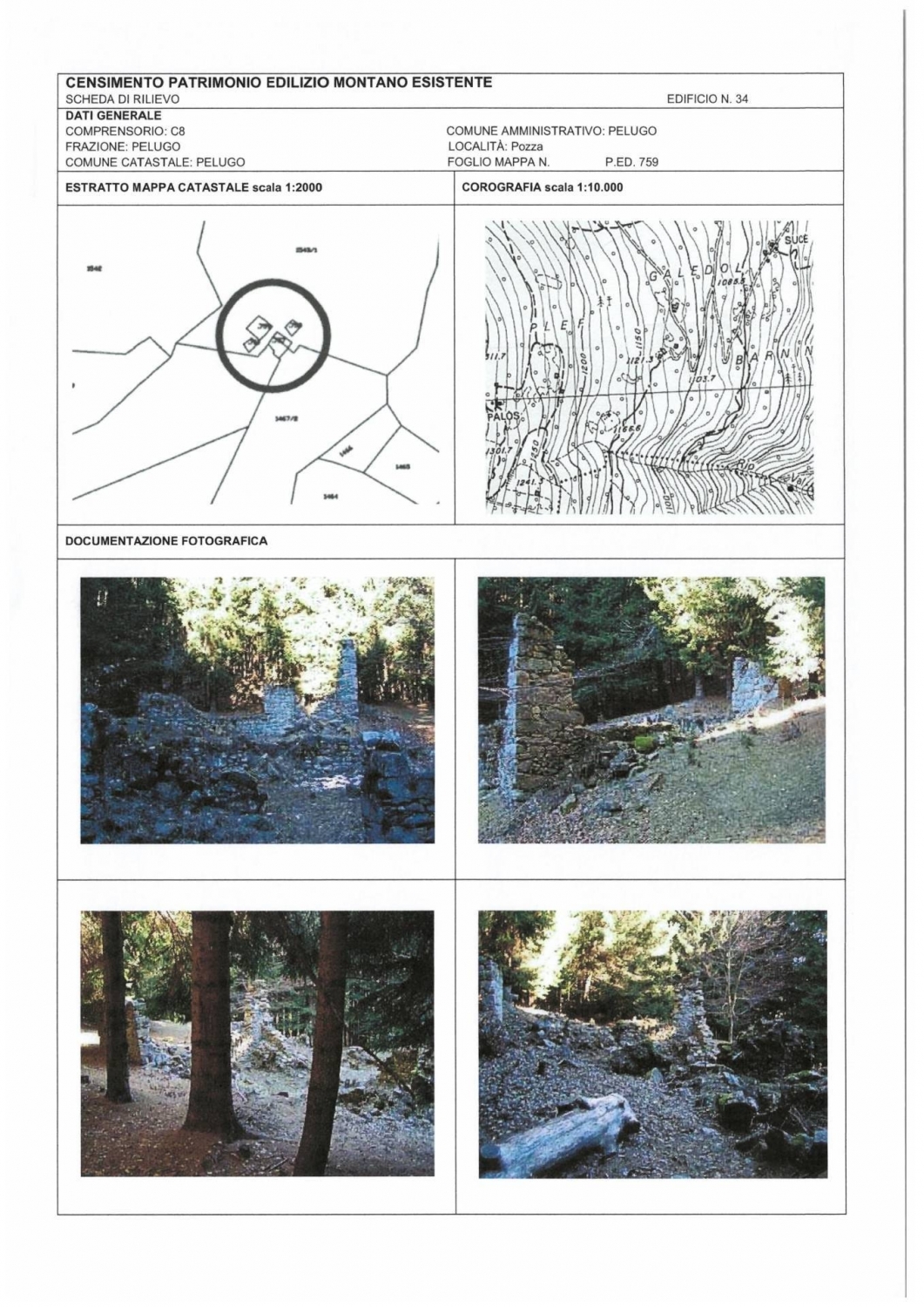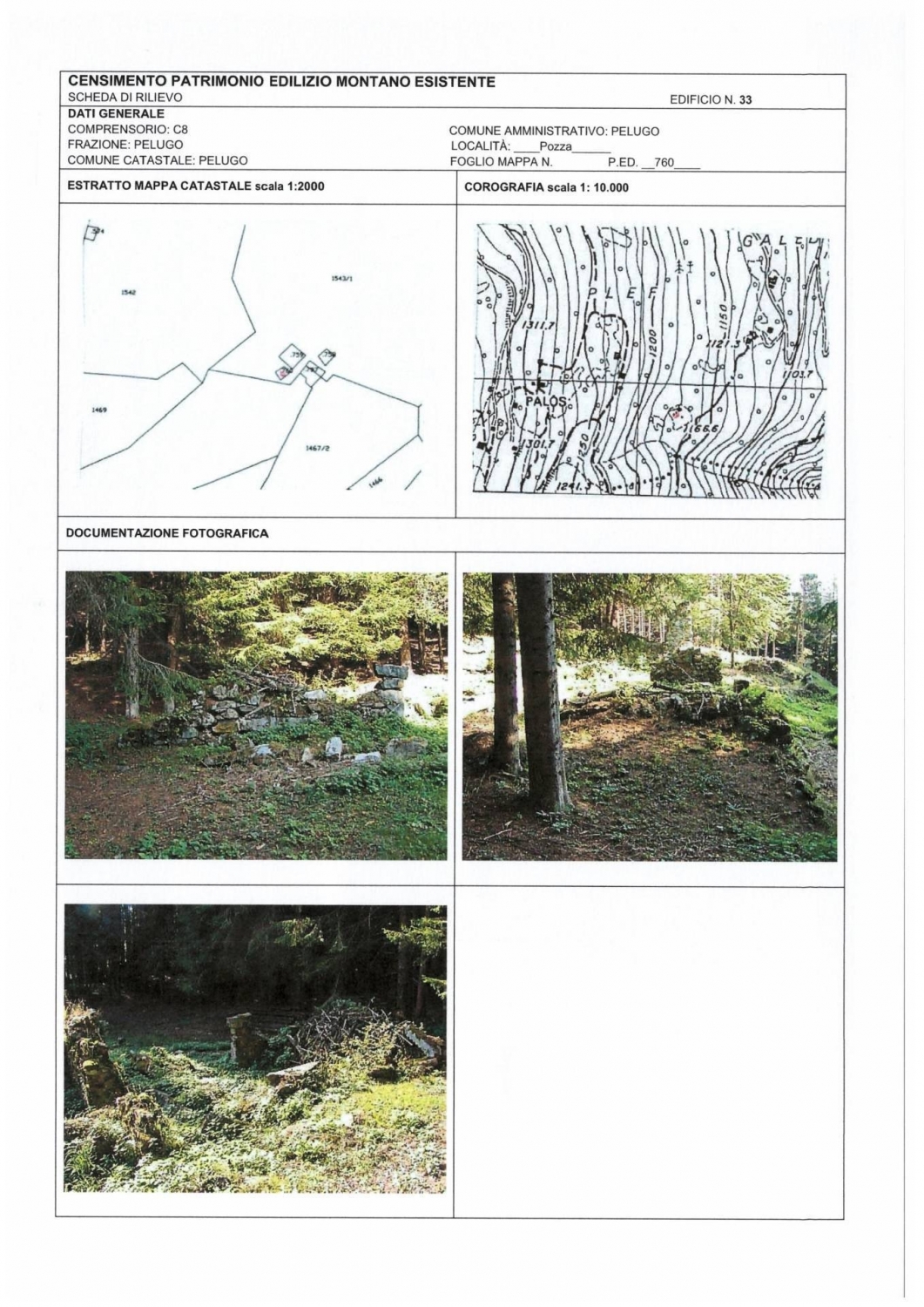 In ottima posizione soleggiata e panoramica sono in vendita due masi da ricostruire in loc. Borgat nel comune di pelugo.un rudere è di 95 mq con la possibilità di ricostruzione su due piani con destinazione abitativo non permanente.l'altro rudere di 30 mq ha la possibilità di ricostruzione ad uso deposito.entrambi i ruderi sono catalogati con scheda del prg del comune di pelugo.completa la proprietà terreno di pertinenza per mq 46.930 oltre ad altri 18.023 mq di proprietà al 50%.ai masi si accede dalla strada comunale con strada privata sterrata.