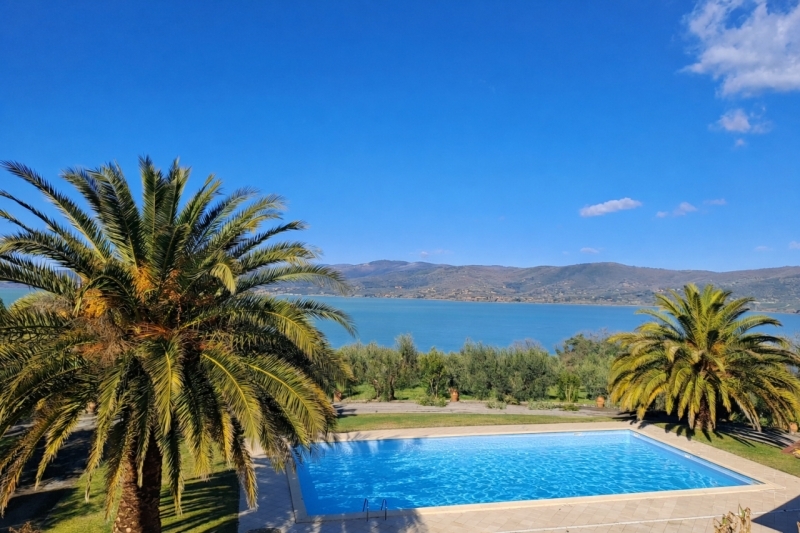 In una delle cornici più esclusive e panoramiche del lago trasimeno, a pochi minuti da san feliciano, noto come il 'paese dei tramonti sul lago', e dal vivace lungolago di passignano sul trasimeno, proprietà di assoluto prestigio, sapientemente ristrutturata e inserita in un contesto di rara quiete e straordinaria bellezza naturale.la dimora è inserita in un elegante complesso residenziale immerso in un parco perfettamente curato di circa 3.500 mq, che è in comune con l'altra porzione di casale posta al piano terra.la porzione di casale, realizzato in autentica pietra, si sviluppa al piano primo con ingresso indipendente e gode di una vista lago straordinaria, ampia e dominante, capace di regalare tramonti spettacolari e scorci di incomparabile fascino in ogni stagione.l'abitazione, di circa 240 mq, si raggiunge tramite una caratteristica scalinata in pietra che conduce a una graziosa loggetta d'ingresso. Gli ambienti interni, frutto di una ristrutturazione attenta e di alto livello, si distinguono per l'accurata scelta dei materiali e per le finiture di pregio, in perfetto equilibrio tra tradizione e comfort contemporaneo.la zona giorno si apre su un ampio e luminoso soggiorno con camino, affiancato da uno studio, entrambi impreziositi da affacci diretti sul lago che donano luce e profondità agli spazi. La cucina, spaziosa e abitabile, è ideale per momenti conviviali in un contesto caldo ed elegante.la zona notte, con raffinata pavimentazione in parquet, comprende due camere da letto, un bagno e una lavanderia. Salendo di soli quattro gradini si accede a un livello rialzato che ospita ulteriori due camere matrimoniali, entrambe dotate di bagno en-suite, garantendo il massimo della privacy e del comfort.completa la proprietà un garage privato di circa 36 mq. in comune con l'unità al piano terra troviamo, oltre al parco, la caratteristica sala giochi (ricavata dall'ex mulino/deposito), la piscina panoramica, un ulteriore locale deposito e i due accessi carrabili con vialetto pavimentato.una residenza di grande charme, perfetta per chi desidera vivere immerso nella bellezza del lago, in un contesto esclusivo, con vista impareggiabile, finiture di alto livello e un'autentica anima umbra. ottima opportunità anche come investimento, ideale per affitti turistici di lusso.