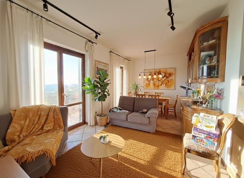 A soli dieci minuti dal vivissimo lungolago di passignano sul trasimeno, sulla suggestiva collina di castel rigone, in posizione panoramica e tranquilla, appartamento, di circa 70 mq residenziali, con ingresso indipendente situato al primo piano di un complesso residenziale composto da sole 10 unità abitative.l'accesso avviene tramite una scalinata esterna di tre rampe che conduce al ballatoio comune, dal quale si entra nell'abitazione.l'appartamento si apre su un luminoso soggiorno con cucina a vista, impreziosito da un'ampia vetrata che appena si entra regala una magnifica vista sul lago trasimeno.completano la zona giorno un grande balcone vivibile e panoramico, un camino e una stufa a pellet.la zona notte comprende disimpegno, bagno e camera matrimoniale.salendo la scala a chiocciola in legno si accede alla soffitta, attualmente adibita a camera per gli ospiti, completamente rifinita e dotata di bagno privato, e balcone vista lago.al piano seminterrato si trovano un ampio garage di circa 20 mq e un'intercapedine di circa 7 mq, ideale come spazio di servizio o deposito.al momento il gpl non è utilizzato per il riscaldamento, ma potrebbe essere ripristinato da chi acquista.nella galleria fotografica sono incluse alcune proposte di arredamento alternative rispetto a quelle attualmente presenti, utili per aiutare l'acquirente a immaginare gli spazi in modi diversi.