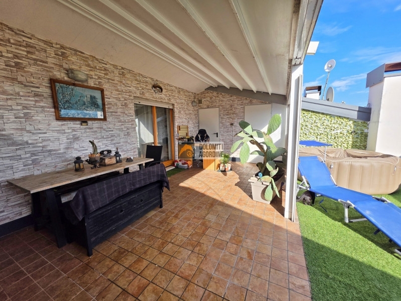Venduto su preliminare. Nel cuore di santa giustina, nella zona centrale e servita del paese, proponiamo in vendita un luminoso appartamento trilocale. L'immobile si trova all'interno di una palazzina moderna con ascensore e ampio parcheggio esterno privato condominiale, ideale per chi cerca comodità sia ai servizi che agli spostamenti quotidiani.l'appartamento si distingue per gli ambienti spaziosi e funzionali: al piano secondo la grande zona giorno open space accoglie un soggiorno moderno con divano angolare, area relax/studio e cucina abitabile su misura dotata di numerosi vani contenitivi ed elettrodomestici integrati. Il pavimento è in ceramica chiara che dona luce naturale a tutti i locali grazie anche alle grandi finestre panoramiche. Presente anche un bagno di servizio completo di box doccia.al piano superiore, troviamo la zona notte, dove cisonoio due camere da letto, bagno finestrato e ripostiglio oltre alla meravigliosa terrazza di circa 40mq con vasca idromassaggio compresa nel prezzo richiesto con orientamento in pieno sole; l'ampia metratura del terrazzo permette inoltre eventuale personalizzazione degli spazi secondo le proprie esigenze.le finiture sono moderne: infissi doppio vetro/legno, riscaldamento autonomo a radiatori ed impiantistica recente garantiscono comfort tutto l'anno. Il riscaldamento è autonomo con caldaia a gas metano. Le spese condominiali sono contenute (solo €50/mese).posizione strategica nel pieno centro cittadino: negozi, banche (come volksbank al piano terra della palazzina), scuole primarie/secondarie raggiungibili a piedi cosù come fermate dei mezzi pubblici soluzione perfetta sia come prima casa che investimento immobiliare data la forte richiesta locativa della zona.possibilità di acquistare a parte un box auto privato.non perdere questa opportunità unica! contatta subito l'agenzia dolomiti agordine per maggiori informazioni o fissare una visita senza impegno.