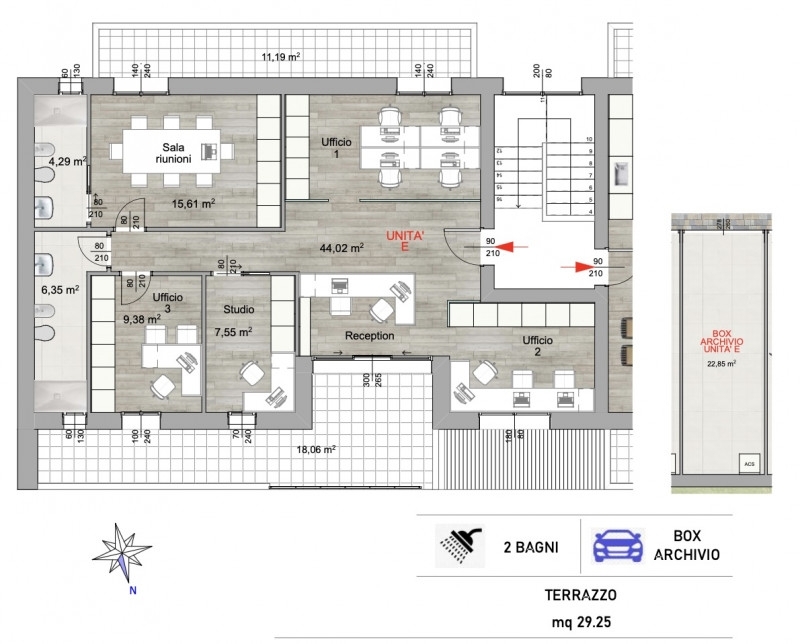 Sei un professionista e vuoi dedicare alla tua attività la giusta location che si merita?ti proponiamo questo moderno ed elegante ufficio direzionale, disposto interamente su un unico livello.con grande zona in ingresso open space di ben 45mq (divisibile), dove poter gestire in maniera pratica e funzionale un'area reception e sala d'attesa oltre che a 3 ulteriori stanze operative/sala riunioni e doppi servizi finestrati.dispone di un garage/archivio molto spazioso e di numerosi parcheggi antistanti.inserito in un moderno contesto residenziale di pochissime unità abitative ed immerso nel verde.situato in zona molto comoda alle principali vie di comunicazione, ben visibile e di buon passaggio veicolare.costruito con le più recenti e attuali tecnologie per garante il massimo comfort abitativo e risparmio energetico.classe energetica prevista 'a4' - valore di progetto
