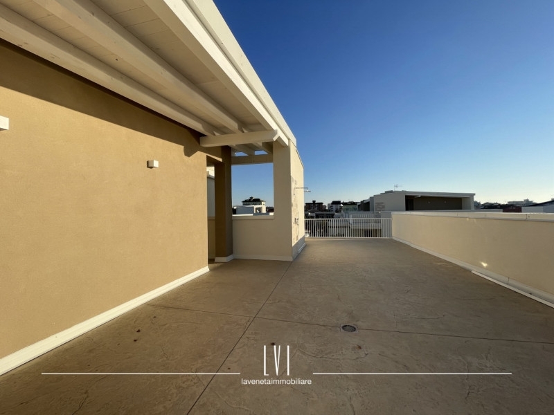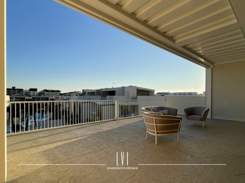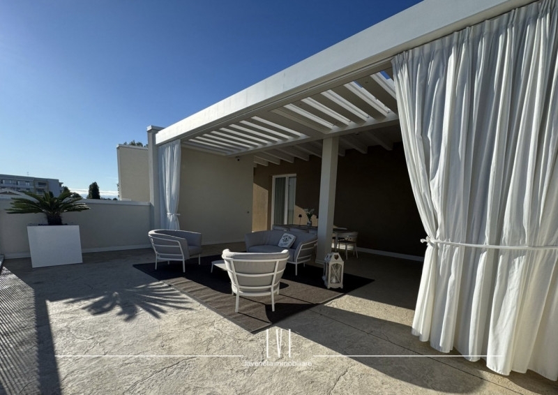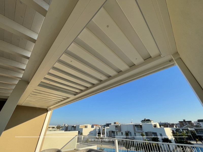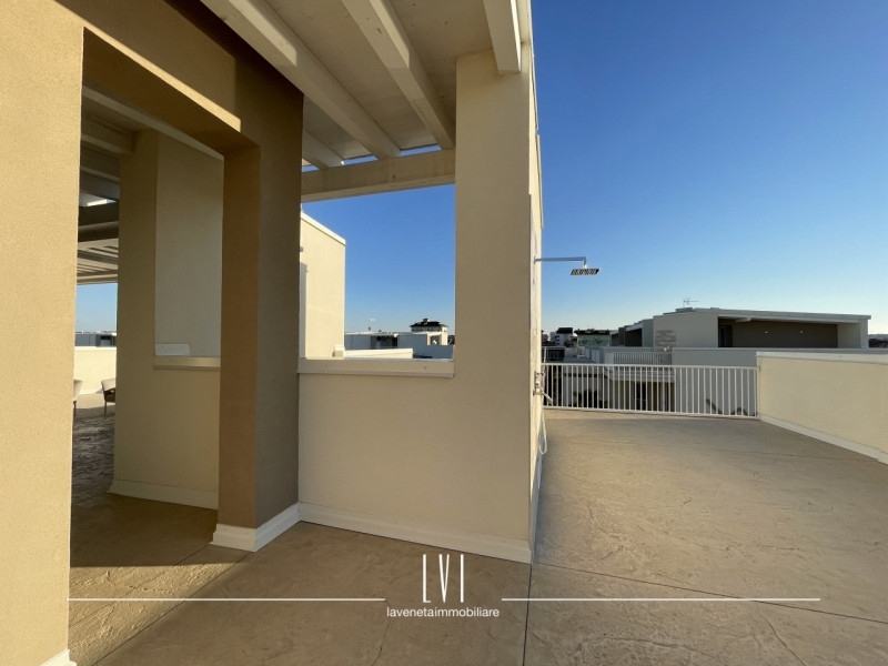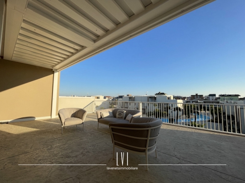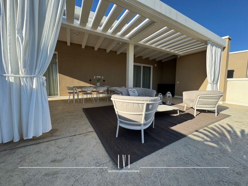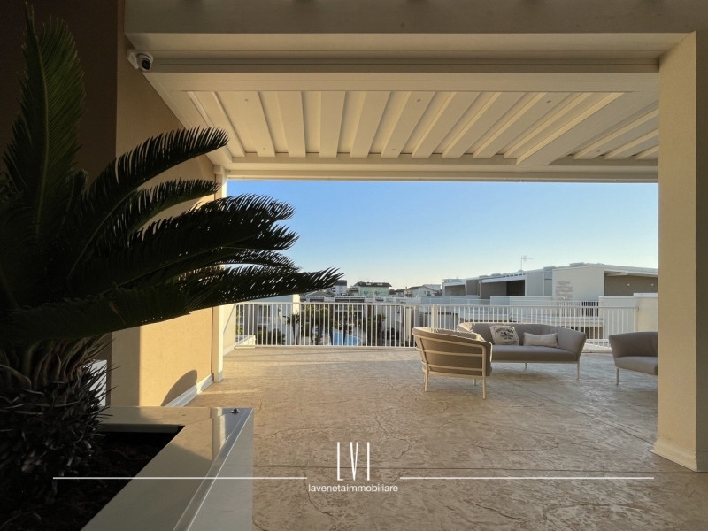 All'interno di wave island, meraviglioso villaggio del 2023 a pochi passi dal mare, proponiamo in vendita esclusiva uno splendido attico con solarium privato di 140mq. l'appartamento presenta un soffitto travato a vista e viene venduto completamente arredato con finiture di altissima qualità.l'esposizione sud-ovest permette una luce autentica e naturale e vista sul tramonto dalla terrazza privata.a disposizione per la sola unità 1,5kw di energia garantendo una classe energetica molto efficiente e consumi ridotti; riscaldamento e aria condizionata canalizzata già predisposti.l'attico è composto da soggiorno, cucina a vista e realizzata su misura con piano in marmo ed elettrodomestici scelti con estrema cura.due camere con mobilio di pregio ed un bagno finestrato con box doccia.dalla camera singola, accesso diretto al balcone di servizio che presenta un'armadiatura su misura davvero capiente ed uno spazio utile per una lavanderia esterna già organizzata.la terrazza di 140mq ben distribuiti tra solarium e loggia, offre una tettoia elettrica con faretti ad incasso aggiunta in un secondo momento da parte della proprietà per ampliare lo spazio del porticato.oltre a questo, il solarium presenta un'ulteriore cucina esterna attrezzata, una doccia e arredo completo.a concludere quest'immobile, un sistema di video sorveglianza privato interno ed esterno per garantire la massima sicurezza, 2 posti auto adiacenti e coperti e spazio utile per le biciclette. nelle zone comuni, troviamo una piscina con sabbia bianca ed aree verdi ben curate facendosi vivere un'atmosfera residenziale di qualità, comfort e design.questo attico si presta perfettamente come soluzione per chi cerca un'abitazione al mare in un contesto di pregio o come investimento destinato a rendita turistica.tassazione agevolata con imposta di registro anziché iva.
