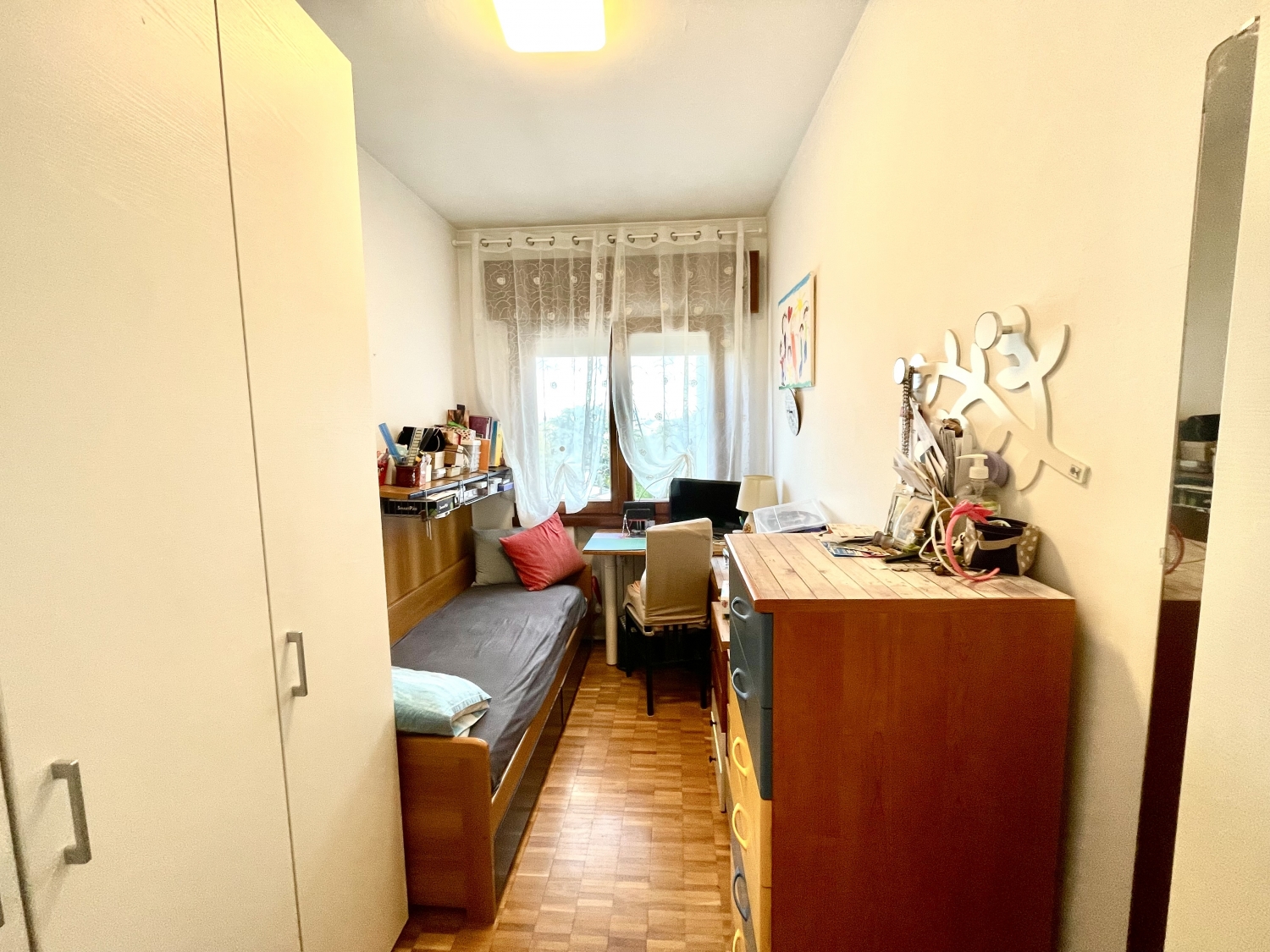 La zona notte si compone di una spaziosa camera matrimoniale, una camera singola perfetta come seconda stanza o studio, un bagno finestrato e un pratico ripostiglio.