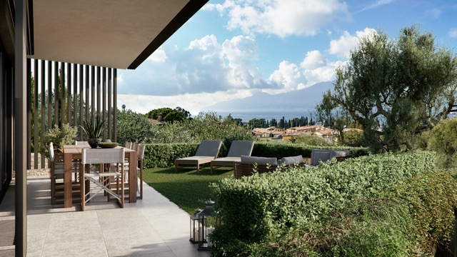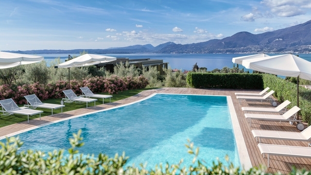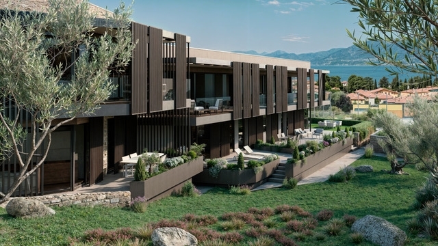 Nel centro prestigioso di torri del benaco, a pochi passi dal celebre castello scaligero e dallo storico lungolago pedonale, proponiamo in vendita una straordinaria villa contemporanea di circa 188 mq all'interno di un elegante residence privato immerso tra ulivi secolari. La posizione dominante regala panorami mozzafiato sulle acque cristalline del lago di garda e sui paesaggi collinari circostanti.l'architettura moderna si distingue per l'utilizzo raffinato della pietra locale e dei legni pregiati, perfettamente integrati nell'ambiente mediterraneo che avvolge la proprietà. Gli interni sono ampi e luminosi grazie alle grandi vetrate scorrevoli che collegano il living open space al giardino privato: uno spazio ideale per pranzi all'aperto o momenti rilassanti nelle zone lounge esterne arredate con stile, godendo dell'incredibile vista sul lago.la villa offre soggiorno moderno, cucina super accessoriata, sala da pranzo conviviale, due camere matrimoniali pensate per garantire privacy assoluta e doppi servizi finestrati rifiniti con parquet posato a spina italiana. Il curatissimo giardino assicura massima riservatezza mentre le aree esterne invitano alla convivialità sotto il cielo azzurro; la terrazza privata è elegantemente arredata ed esposta verso gli uliveti circostanti.il residence dispone inoltre di uno spettacolare solarium fronte lago dotato di piscina attrezzata con lettini prendisole sotto ombrelloni bianchi ed esclusiva vasca idromassaggio: lo scenario perfetto dove rigenerarsi dopo una giornata estiva o trascorrere piacevoli serate tra amici.comfort totale tutto l'anno grazie alla domotica avanzata; basse spese condominiali (solo €100/mese) rendono questa soluzione ideale sia come abitazione principale sia come investimento ad alto valore anche grazie alla forte domanda internazionale verso torri del benaco famosa per spiagge dorate, borghi pittoreschi ed eventi culturali facilmente raggiungibili a piedi dalla proprietà.un'opportunità irripetibile per chi desidera vivere circondato dalla bellezza senza tempo! contatta subito la nostra agenzia per maggiori informazioni o prenota ora la tua visita guidata.