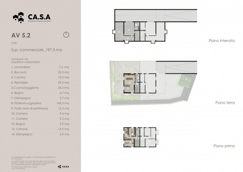 Unità 5.2 in residenze ca.s.a. è composta da una bifamiliare affiancata nel blocco 2. Tale soluzione è sviluppata su tre livelli con ingresso privato. living, 3 camere e 2 bagni finestrati. Grande piano interrato con taverna, lavanderia e garage doppio.completa la proprietà un posto auto privato ed un giardino su tre lati di circa 150 mq. residenze ca.s.a.vivere il verde, a due passi dalla cittàa pochi minuti da vicenza sta per nascere residenze ca.s.a., un nuovo complesso abitativo pensato per chi desidera riservatezza, qualità della vita e contatto con il verde, senza rinunciare alla comodità dei servizi.un intervento unico nel panorama di vicenza città e zona ovest, per posizione, concezione e varietà di soluzioni abitative.________________________________________un nuovo modo di abitareall'interno di una grande area verde di circa 8.000 mq, il progetto prende forma in un contesto tranquillo e sicuro, ideale per famiglie e per chi cerca uno stile di vita più equilibrato.a soli 5 minuti d'auto da vicenza e a breve distanza da tutti i servizi quotidiani, residenze ca.s.a. Offre:•ampie zone verdi comuni•aree a verde privato•spazi sicuri dove i bambini possono giocare in libertàle prime unità saranno consegnate nella primavera 2027.