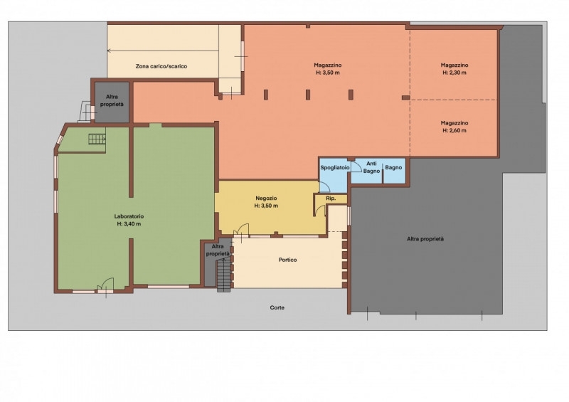 Vi proponiamo un locale commerciale/artigianale con ampio magazzino, si trova all'interno di un edificio condominiale di due piani e composto da 6 unità, 4 abitative, 2 commerciali. L'unità si sviluppa interamente al piano terra, l'accesso principale è pedonale ed è situato nel portico fronte strada dove si affaccia la parte adibita a negozio, dotata di spogliatoio, anti bagno e bagno, dall'ingresso si accede all'area di produzione artigianale dove sono presenti due celle frigo e una cappa aspirante per alimenti; proseguendo si accede all'area di maggiori dimensioni adibita a magazzino, cieca e dotata di banchina di carico per furgoni e camion di piccole dimensioni. Completano la proprietà una corte dove posso essere parcheggiate fino a tre auto. La precedente attività era un pastificio. L'unità è stata edificata ante '67 ma rimodernata nel 2020.